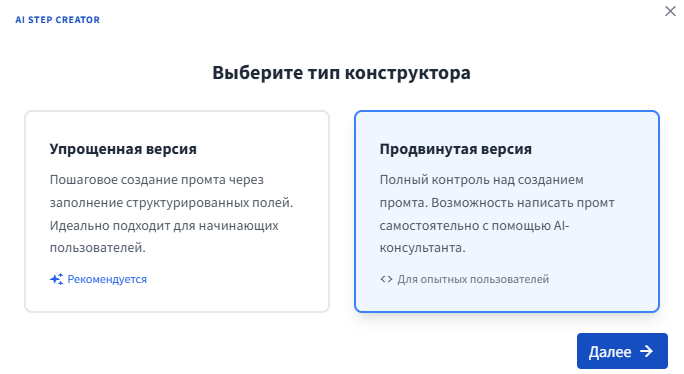 При создании AI асситента выбираем Продвинутая версия и нажимаем Далее: