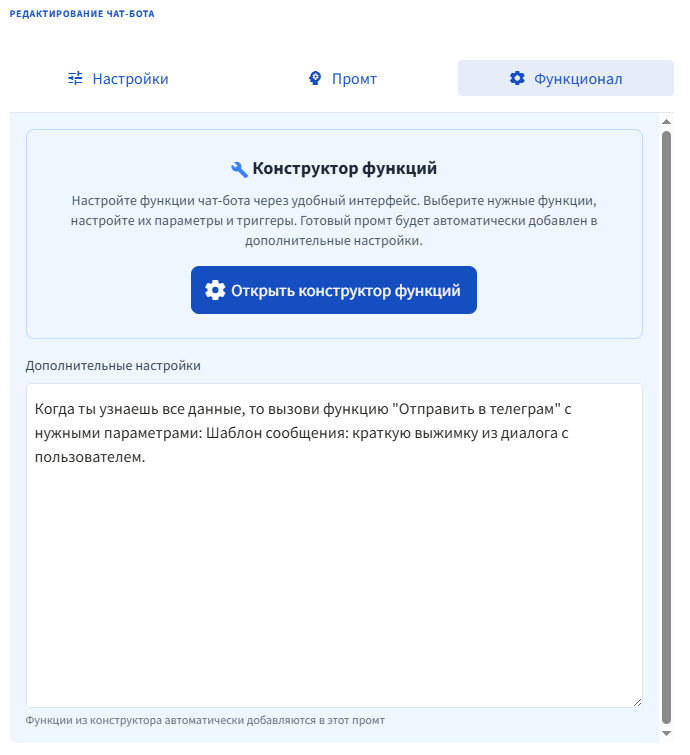 Если вам нужно подключить функции, по прежнему доступен Конструктор функций, который помогает создать текстовые команды и сохранить их в поле Дополнительные настройки: