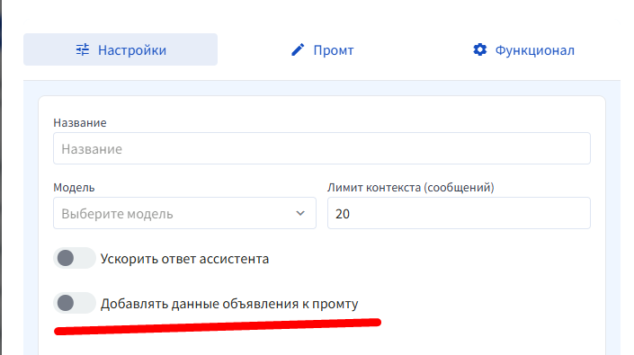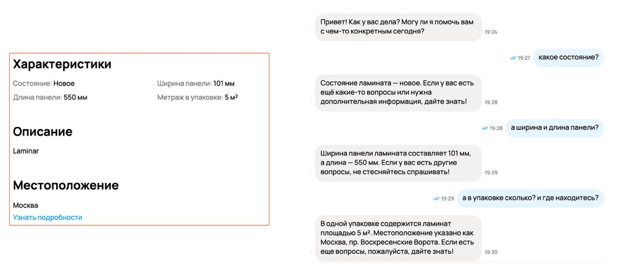 ИИ ассистент видит данные по объявлению, на которое написал клиент.